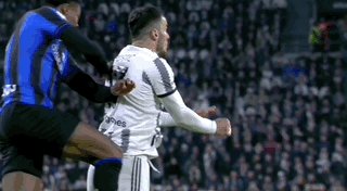 第90+5分钟,邓弗里斯禁区内力压科斯蒂奇头球,布雷默手球犯规,裁判吹点球,卢卡库主罚命中,1比1!