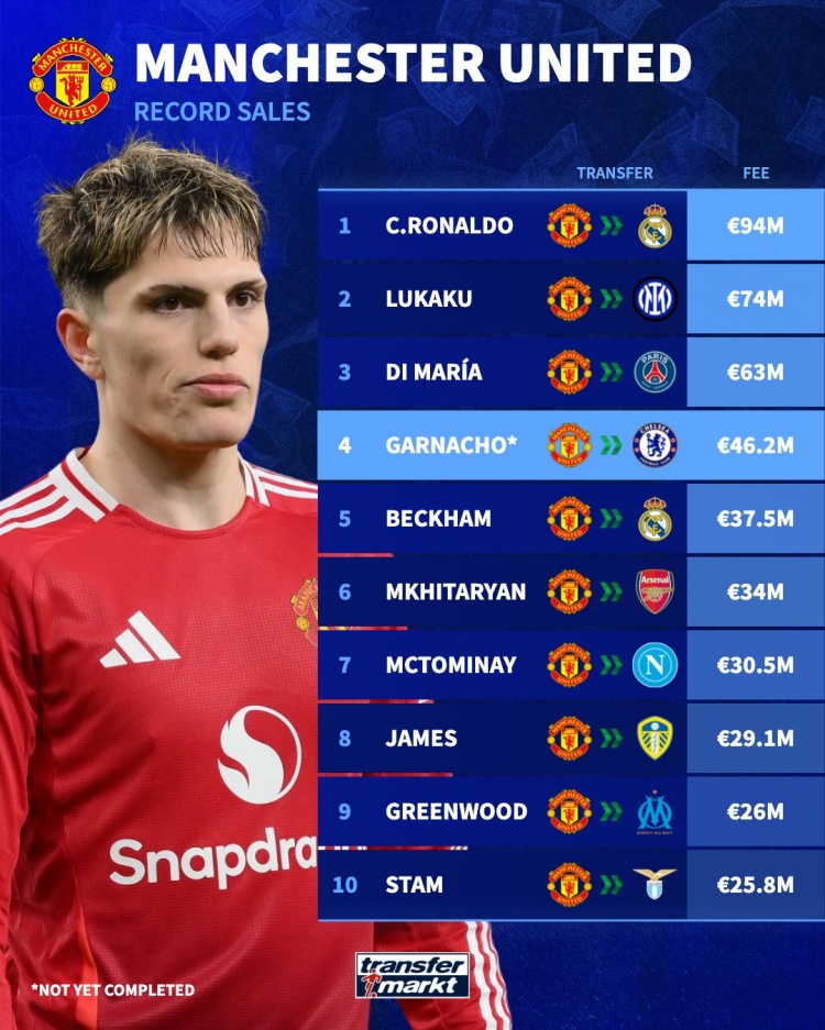8月29日,多家媒体报道称曼联边锋加纳乔将以4620万欧元身价加盟切尔西。德国转会市场数据显示,这笔交易将使其成为曼联队史出售身价第四高的球员。